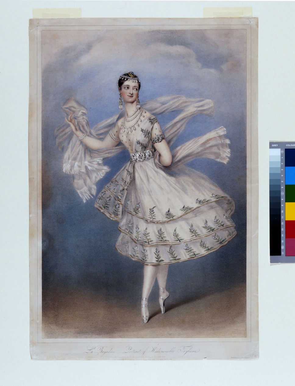 fig. 15 Alfred Edward Chalon (artist) and Richard James Lane (lithographer), La Bayadère - Portrait of Mademoiselle Taglioni (c.1830), printed by Graf & Soret, published by Ackermann & Co. and Rittner & Goupil, London, hand colored lithograph, 57.4 x 38.4 cm, Victoria and Albert Museum, London