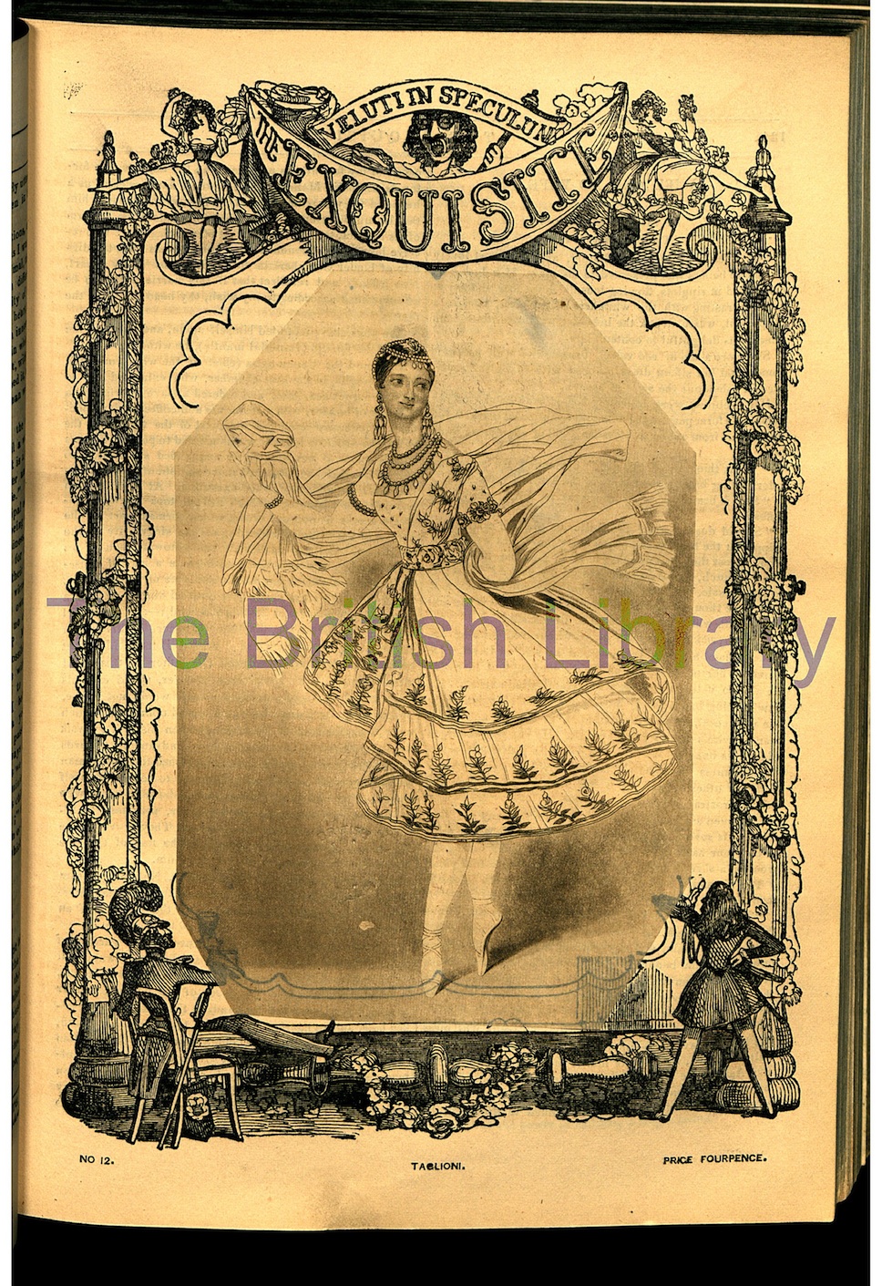 This (fig. 14) is a picture of Marie Taglioni in the role of Zoloe the slave girl in the ballet The God and the Bayadère mounted on the front cover of The Exquisite. The Exquisite was a magazine of ‘amatory adventures’ published between 1842 and 1844 by the radical printer and agitator William Dugdale under the pseudonym H. Smith from premises on London’s notorious Holywell Street. The magazine frequently featured stories of whipping and chastisement and appealed to the military fops and civilian dandies pictured on its title page. The orientalized proscenium of the frontispiece bears the same Latin motto as Covent Garden Opera House: veluti in speculum (as seen in a mirror) surrounded by two high-kicking dancers and is adorned with pirated prints of ballerinas on the first thirty issues of the magazine.