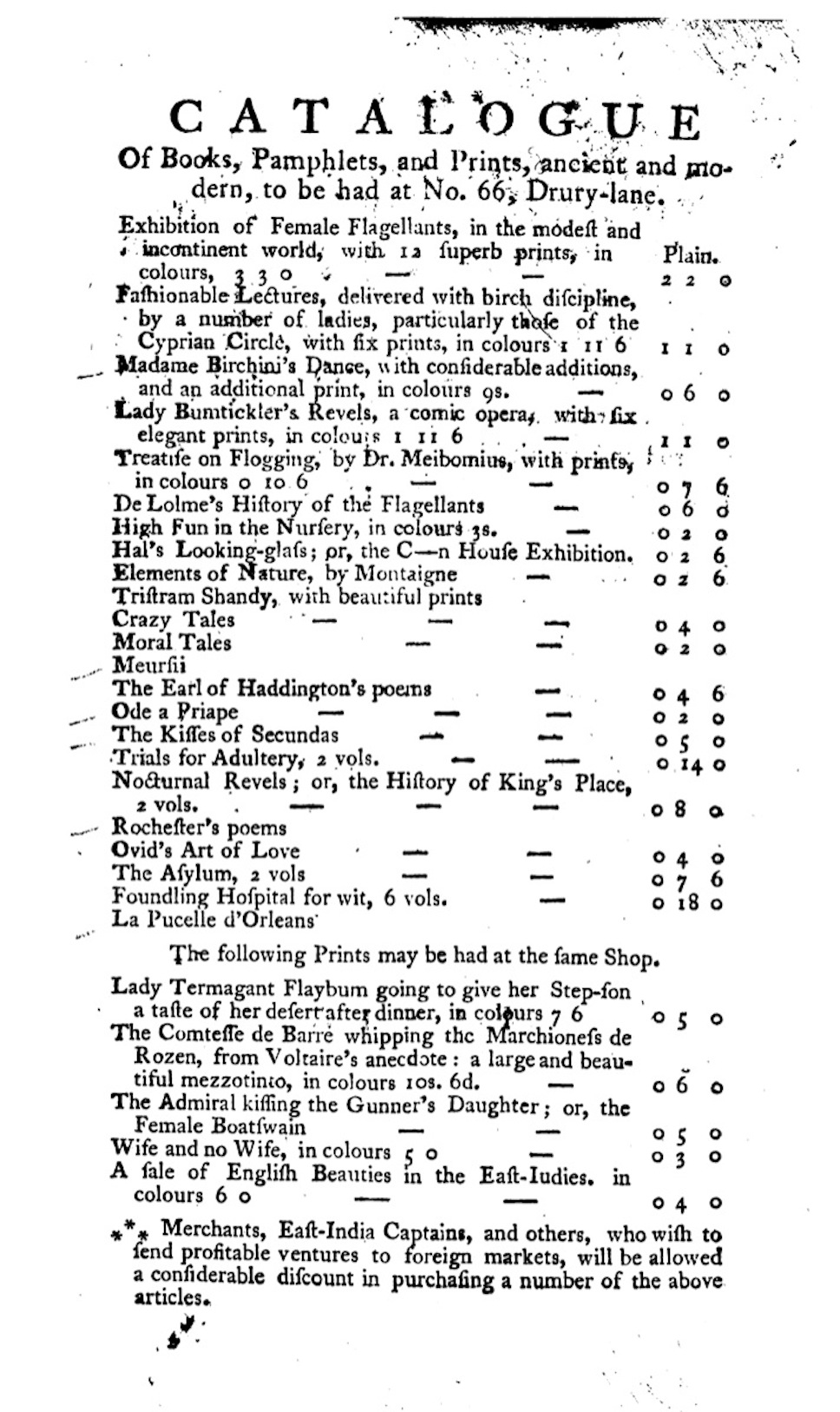 The catalogue (fig. 13) printed at the back of Madame Birchini’s dance shows the other sorts of text that circulated alongside it—Tristram Shandy, adultery, flagellation, Ovid, Rochester, Ode to Priapus. Then there is a list of images—including ‘A Sale of English Beauties’. Then there is a note which offers discounts to EIC soldiers and merchants. The Gillray and Rowlandson images visualize the Anglo-Indian trade in obscene print matter described in this catalogue which connected dancers, flagellation, merchant traders, soldiers, slavery, obscenity and disease in a colonial economy of sex, war and dancing.